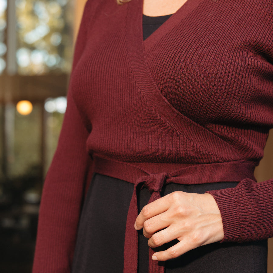 Wrap yourself in softness. Adeline’s ribbed crossover silhouette layers beautifully or stands on its own for relaxed, polished style.