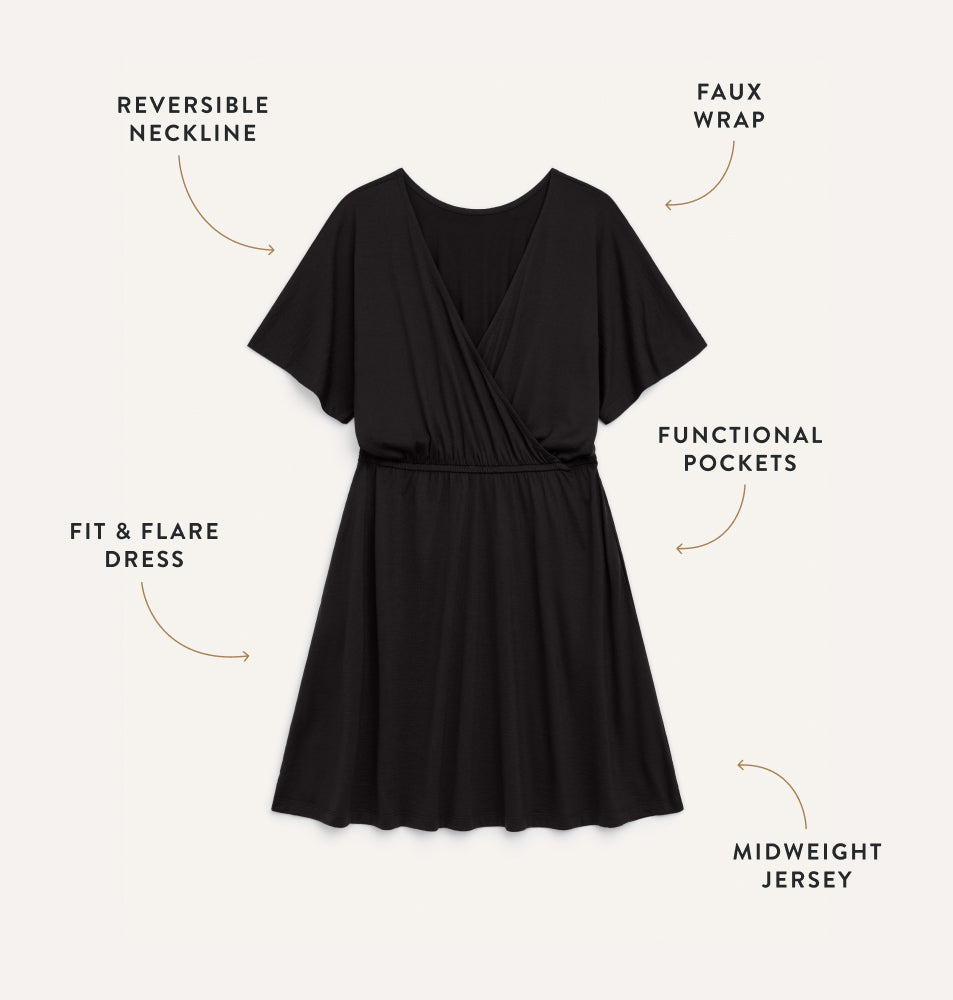 With its reversible neckline, the Brooklyn can be worn as a faux wrap or high boat neck, front or back. Wear it either way for an elevated look. In-seam pockets. Long adds 3" to the hem.