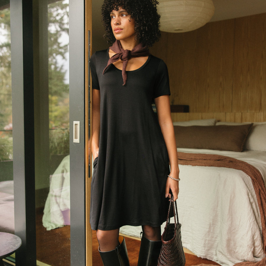 A swing dress with a slimmer cut, short sleeves, and a scoop neck. Pocketed and pairs well with just about everything.