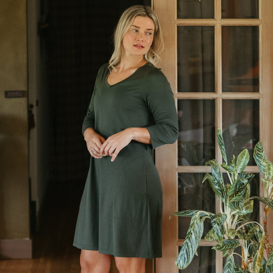 We made some updates to this classic V-neck swing dress: more fitted through the upper body, slightly heavier fabric, and new inseam pockets.